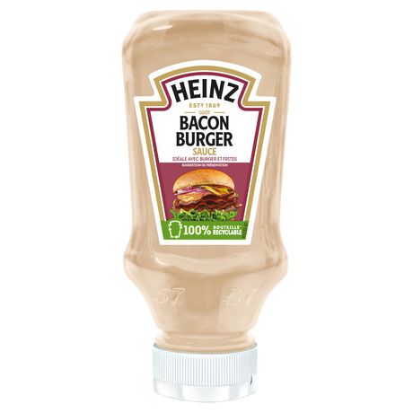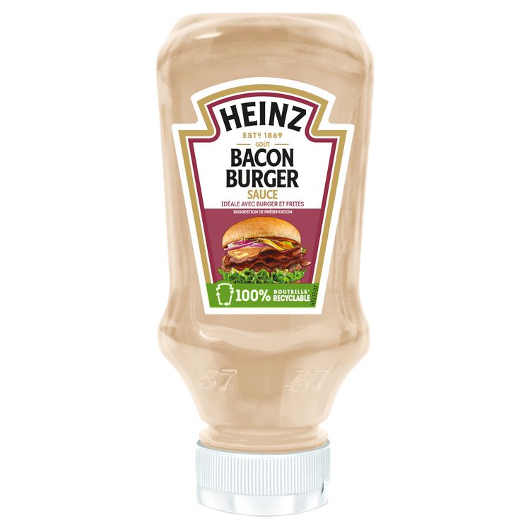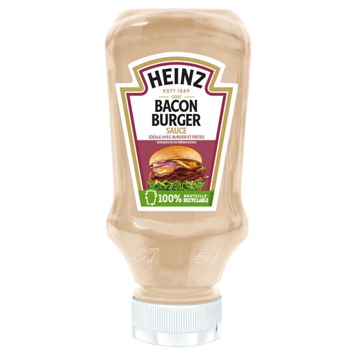 Découvrez la sauce Bacon Burger Heinz. Une sauce snack piquante et onctueuse à base de tomates, avec des émincés d'échalotes et de persil, pour raviver vos papilles. Cette recette au bon goût de l'Amérique va relever vos plats les plus divers : poissons, crustacés, volailles, veau, crevettes, avocat, œuf dur... ou simplement pour agrémenter votre hamburger. Pour un maximum de praticité, découvrez cette bouteille souple "tête en bas" équipée d'un bouchon à valve en silicone. Pour une sauce toujours prête à être dégustée, un dosage facile et un bouchon toujours propre après usage. Cette sauce est disponible en flacon souple au format 220g.