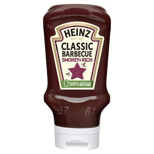 Découvrez la sauce Heinz Barbecue Classique. Une sauce au goût unique de tomates et d'épices, relevé d'une subtile note fumée caramélisée, évocatrice des goûts du Far West et parfaite pour toute la famille. Filets de porc, ailes de poulet marinées, magret de canard ou encore crevettes et gambas, vous aurez l'embarras du choix ! Pour un maximum de praticité, découvrez cette bouteille souple "tête en bas" équipée d'un bouchon à valve en silicone. Pour une sauce toujours prête à être dégustée, un dosage facile et un bouchon toujours propre après usage. Cette sauce est disponible en flacon souple au format 480g et 260g.