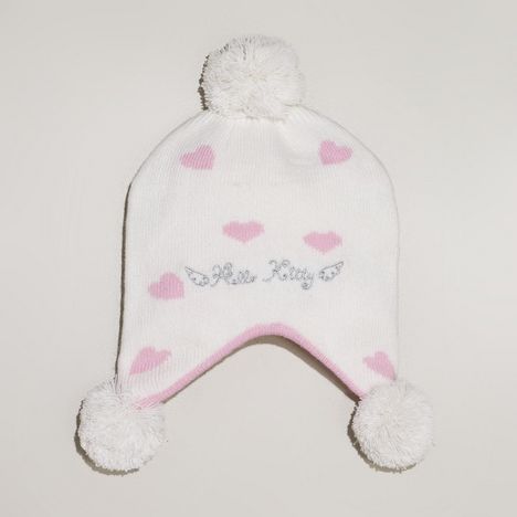 Pour affronter le froid cet hiver, craquez pour ce bonnet bébé fille en tricot Hello Kitty. Maille douce et bien chaude. A la fois ludique avec ses 3 pompons et bien pensé pour recouvrir les oreilles de bébé. Motifs cœurs et broderies Hello Kitty sur le devant et au dos. Bords contrastants.