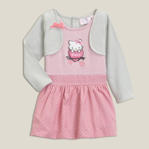 Très charmante cette robe bébé Hello Kitty ! Robe bi-matière : haut en jersey et base en velours. Effet de 2 en 1 boléro sur tee-shirt. Col rond. Manches longues. Ouverture pressionnée en haut du dos. Nœud en ruban velours. Base forme boule. Cette robe Hello Kitty pour bébé est lavable en mach