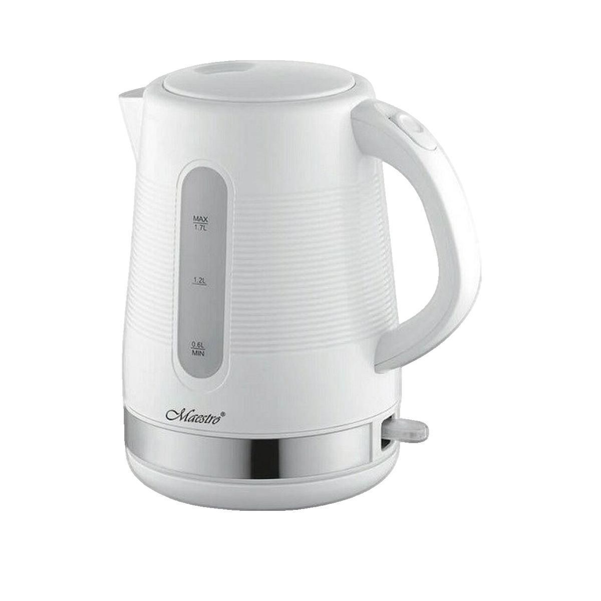 Découvrez la bouilloire électrique Maestro MR-035 de la marque feel-maestro. Ce modèle moderne en blanc présente une capacité de 1,7 litre et une puissance de 2200 W pour un chauffage rapide de l'eau. Elle est équipée d'un indicateur de niveau d'eau, d'un arrêt automatique pour la sécurité en cas de