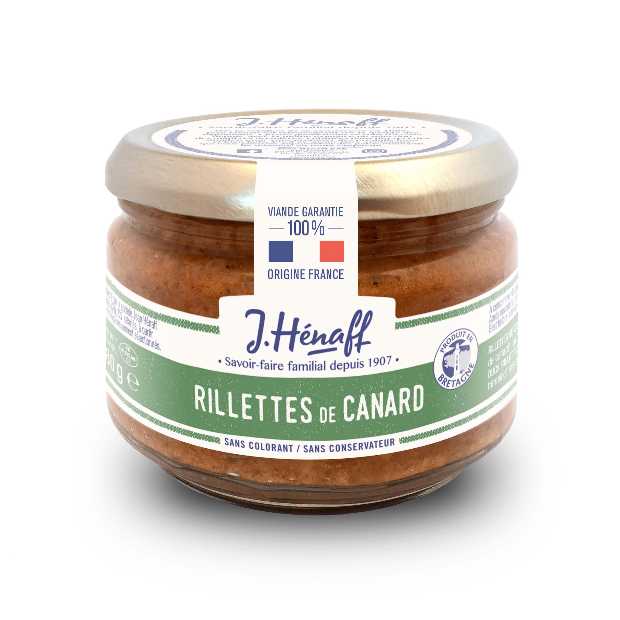 Origine du produit fini «RILLETTES CANARD HENAFF 180G» : FRANCE. Volaille : Né, élevé, abattu en France