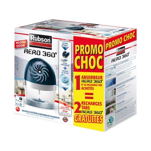 En savoir +Adapté à toutes les pièces de la maison : salle à manger, salon, chambre à coucher, bibliothèque, bureau …L’absorbeur d’humidité Rubson AERO 360° permet de réguler le taux d’humidité de votre intérieur. Il aura des effets bénéfiques sur votre santé, votre intérieur et votre confort. Ce pack se compose de l'absorbeur et de 3 recharges.
