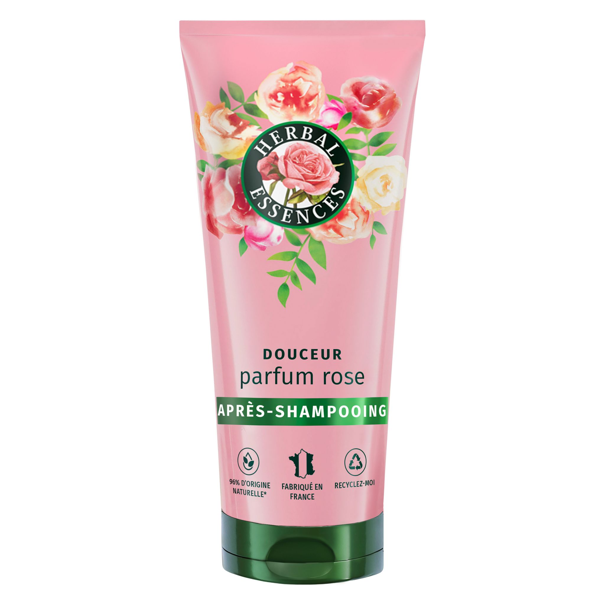 herbal essences, bien-être, vegetal, nature, non testé sur les animaux, shampoing naturel, emballage recyclable, herbal essences après shampoing, après shampoing naturel, eau purifiée, végane, huile de rose, pétale de rose, sans silicone, plastique recyclé, après shampoing sans sulfate