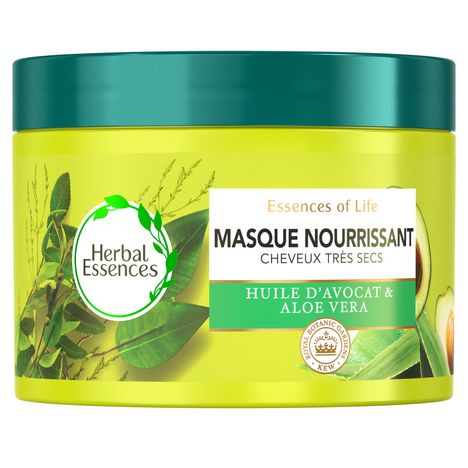 Le masque capillaire Nourissant Essences of Life à l’huile d’avocat et à l’aloe vera pénètre en profondeur et hydrate les cheveux très secs pour révéler leur beauté naturelle. Pour des cheveux plus doux et plus lisses. Chez Herbal Essences, nous croyons à la puissance nourrissante des plantes. Nous avons conçu des soins capillaires qui redonnent vie à vos cheveux, à votre moral et à la planète. Les formules enrichissantes d’Herbal Essences sont infusées d’essences végétales pures et de nutriments d’origine végétale, embouteillés dans un emballage conçu de manière responsable. Dévoilez vos plus beaux cheveux et laissez-vous tenter par un moment de joie tout en protégeant la planète.