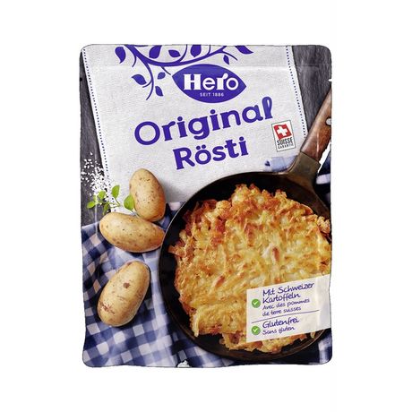 Déchirer prudemment l'emballage en tirant sur la languette et appuyer à plusieurs reprises sur les côtés du sachet pour décoller les rösti. Ouvrir largement le sachet, répartir régulièrement les rösti dans une poêle antiadhésive sans ajouter de matière grasse et faire cuire à feu moyen. Retourner les rösti à l'aide d'une assiette et laisser cuire jusqu'à ce qu'ils soient bien dorés. De temps à autre, appuyer légèrement sur les rösti. Temps de préparation : env. 15-20 minutes