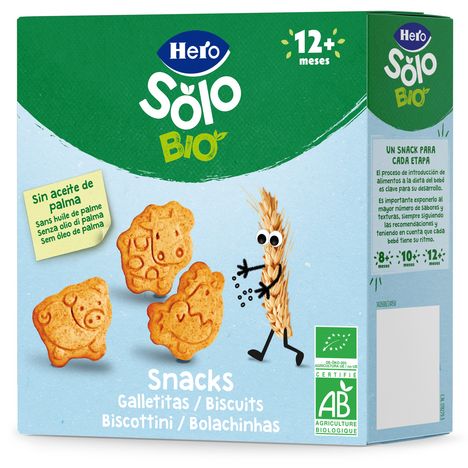 Snacks de biscuits animaux Hero Solo. Dès 12 mois. Snacks 100% Bio. Elaboré avec des matières premières 100% Bio. Format 100 g.