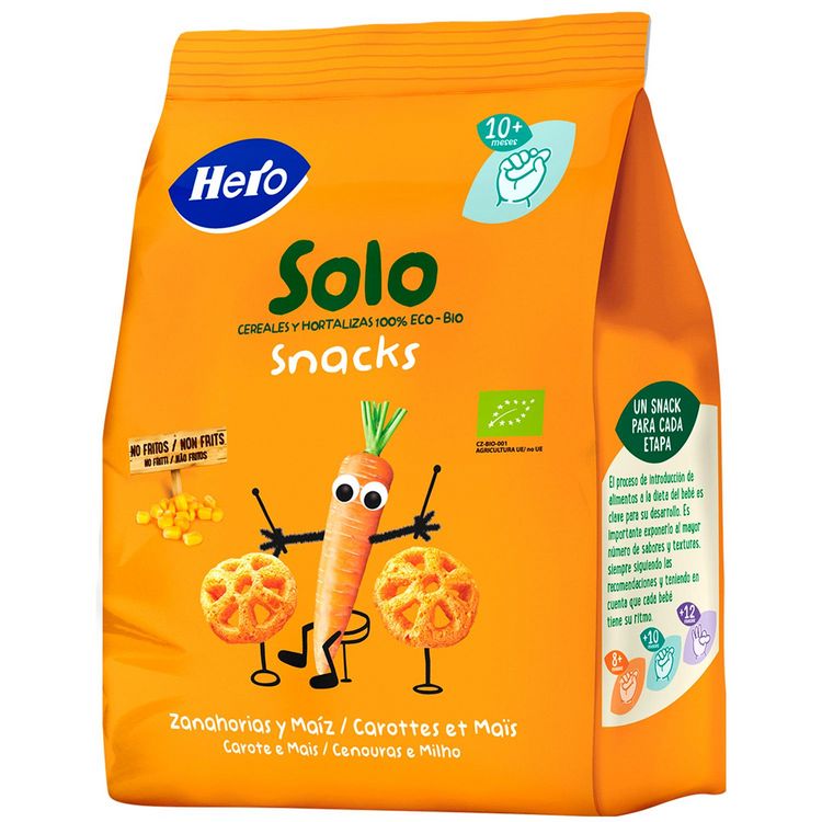 Snack bio de carotte et maïs de Hero Solo, dès 10 mois. Snack de légumes et céréales, non frits, sans conservateurs ni colorants et sans sel ajouté. Elaboré avec des matières premières 100% Bio.