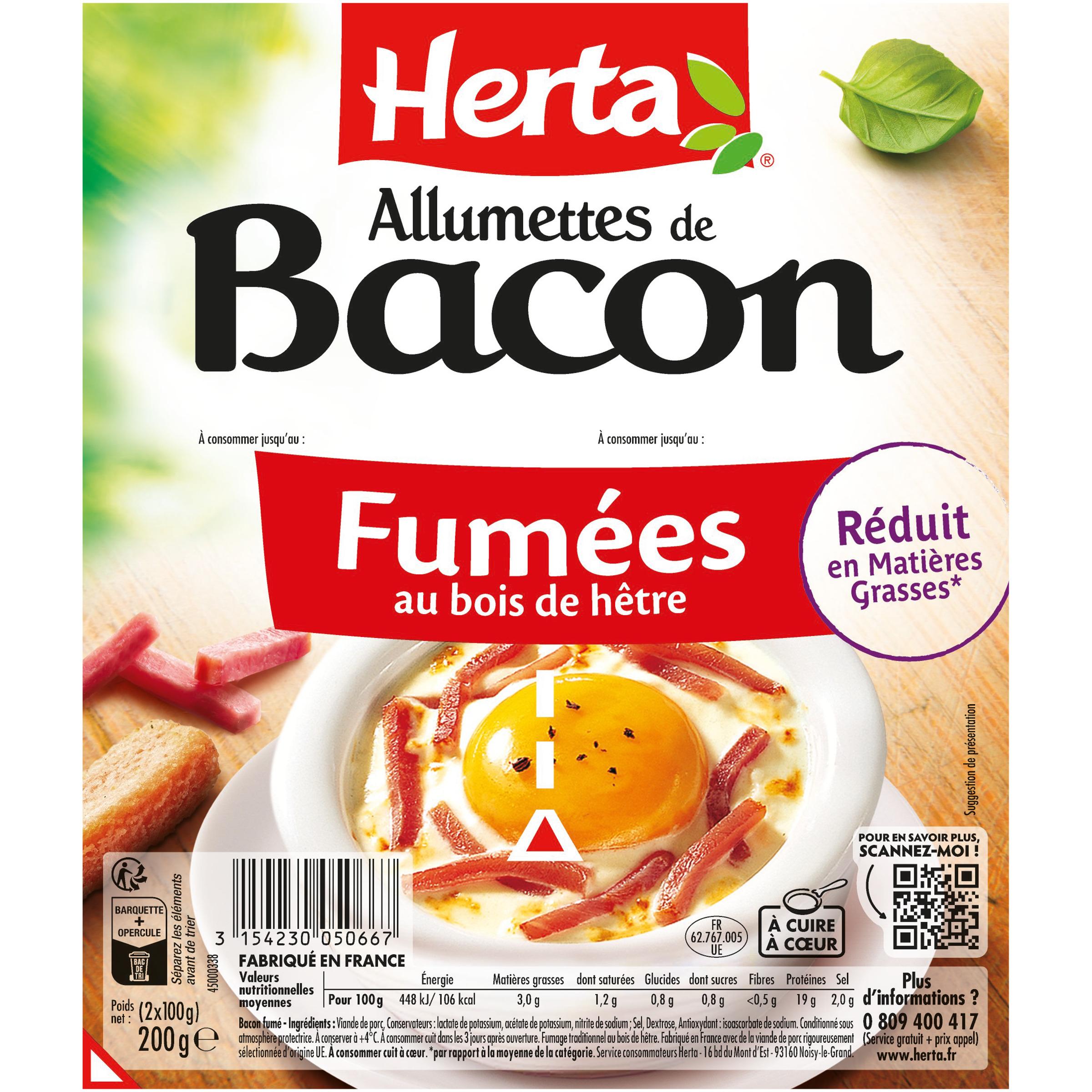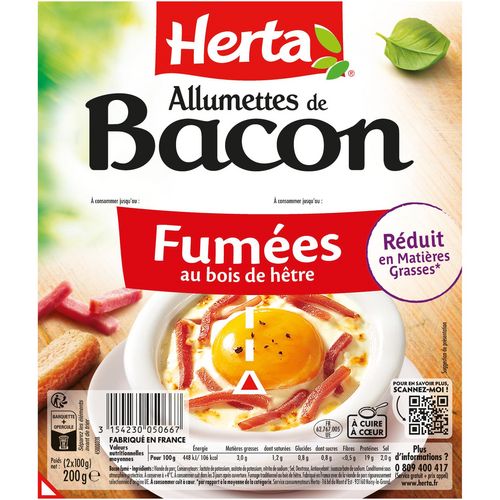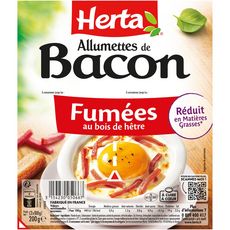 Finement découpées, les allumettes de bacon HERTA s'accorderont à merveille à vos préparations quotidiennes (vos salades ou vos quiches par exemple) pour 100% de plaisir. Fumées au bois de hêtre, ces allumettes de bacon ne contiennent que 3% de matière grasse et vous permettent de donner du goût à vos plats en toute légèreté.