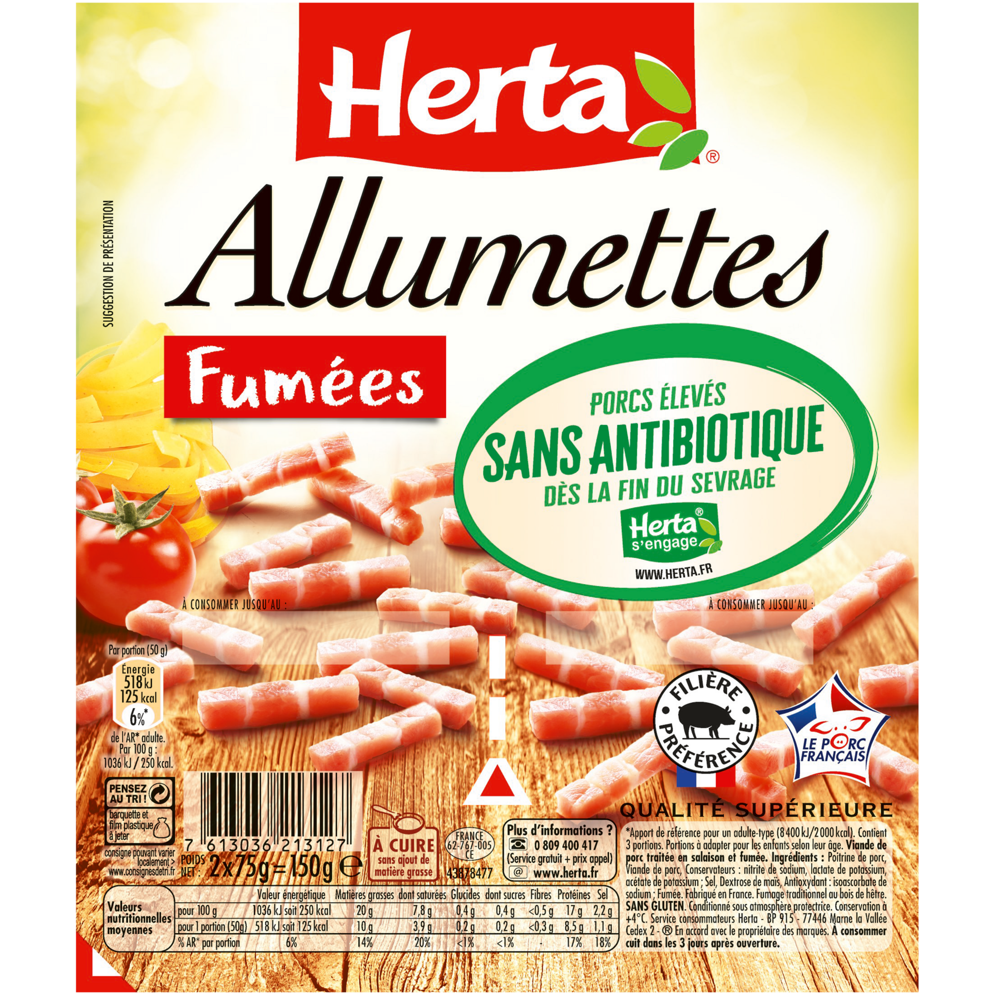 Viande de porc traitée en salaison et fumée HERTA lance une nouvelle gamme d'ingrédients issus de porcs élevés sans antibiotique dès la fin du sevrage. Avec leur découpe extra fine, les allumettes fumées HERTA seront idéales dans vos salades, pâtes ou omelettes. Elles joueront aussi les stars dans les farces, les quiches… bref, les allumettes de porc HERTA font partie des indispensables du frigo ! Viande issue de la Filière Préférence HERTA, un partenariat entre HERTA, plus de 200 éleveurs français et des abattoirs afin de promouvoir de bonnes pratiques d'élevage dans trois domaines clés : nutrition animale, bien-être animal et environnement. Viande certifiée VPF.