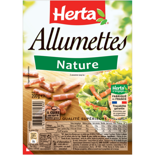 Avec leur découpe fine, les allumettes nature HERTA sont idéales dans vos salades, pâtes ou omelettes. Avec une découpe extra-fines, elles sont également parfaites pour réaliser des farces ou des quiches… Bref, les allumettes de porc HERTA, fabriquées en France à St Pol sur Ternoise, font partie des must-have du frigo ! Viande de porc traitée en salaison