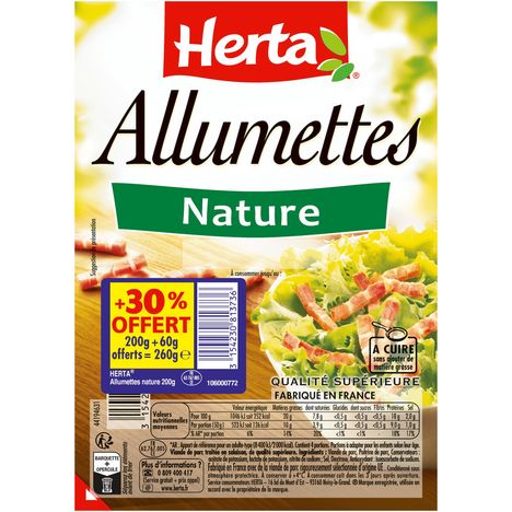 Avec leur découpe fine, les allumettes nature HERTA sont idéales cuites dans vos salades, pâtes ou omelettes. Avec une découpe fine, elles sont également idéales pour réaliser des farces ou des quiches… Bref, les allumettes de porc HERTA, fabriquées en France à St Pol sur Ternoise, font partie des must-have du frigo !