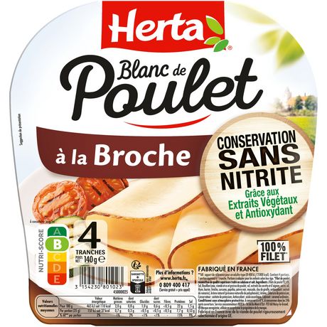 Découvrez le Blanc de Poulet Broche Conservation Sans Nitrite grâce aux extraits végétaux et antioxydant HERTA. Une recette à la broche savoureuse qui allie le bon goût de la volaille au romarin ; une texture généreuse et gourmande pour le plaisir des familles au quotidien.