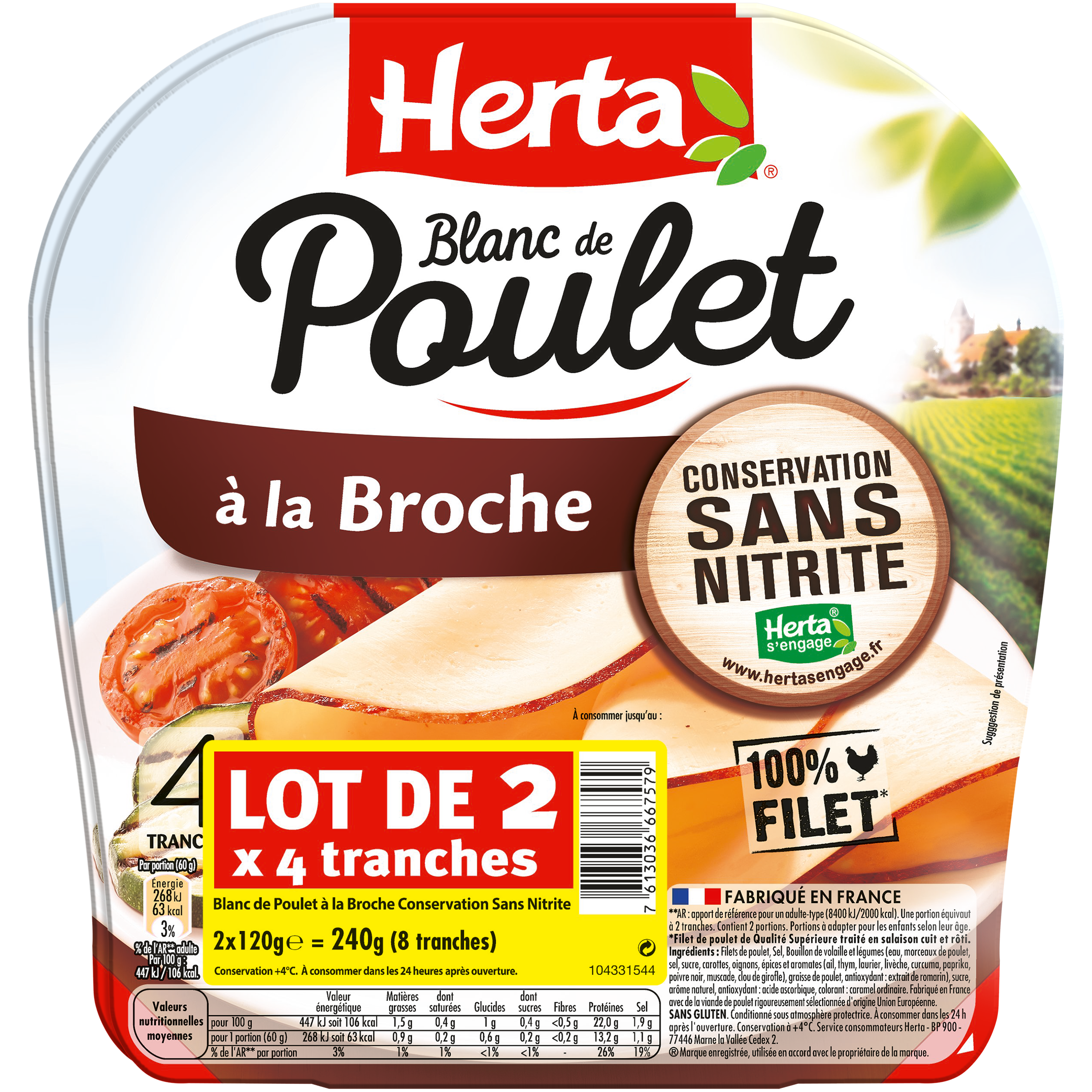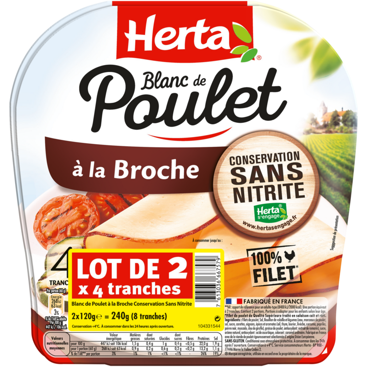 Ingrédients: Filets de poulet, sel, bouillon de volaille et légumes (eau, morceaux de poulet, sel, sucre, carottes, oignons, épices et aromates (ail, thym, laurier, livèche, curcuma, paprika, poivre noir, muscade, clou de girofle), graisse de poulet, antioxydant : extrait de romarin), sucre, arôme naturel, antioxydant : acide ascorbique, colorant : caramel ordinaire.