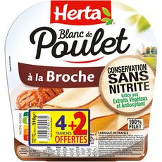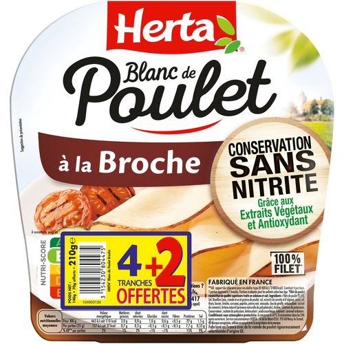 Découvrez les recettes de la gamme blanc de poulet Conservation Sans Nitrite grâce aux extraits végétaux et antioxydant HERTA : le premier* blanc de poulet du marché au mode de conservation sans nitrite. Une recette simple et savoureuse qui allie le bon goût de la volaille à celui du romarin. La gamme blanc de poulet c'est également une texture plus généreuse qui permet une meilleure mâche pour le plaisir des familles au quotidien. *1ère marque distribuée à l'échelle nationale en grandes surfaces alimentaires.
