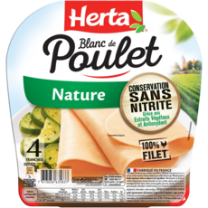 Découvrez la nouvelle gamme blanc de poulet Conservation Sans Nitrite de HERTA : le premier jambon de volaille du marché au mode de conservation sans nitrite. Une recette simple et savoureuse avec du filet de poulet rigoureusement sélectionné, un bouillon travaillé, une pincée de sel, une touche de sucre et de l’acide ascorbique (Vitamine C) pour son rôle antioxydant. Filet de poulet de Qualité Supérieure traité en salaison et cuit
