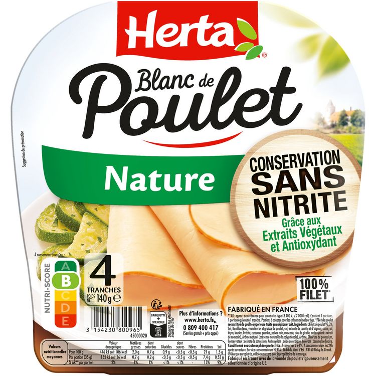 Découvrez le Blanc de Poulet Nature Conservation Sans Nitrite grâce aux extraits végétaux et antioxydant HERTA. Une recette savoureuse qui allie le bon goût de la volaille au romarin ; une texture généreuse et gourmande pour le plaisir des familles au quotidien. *1ère marque distribuée à l'échelle nationale.