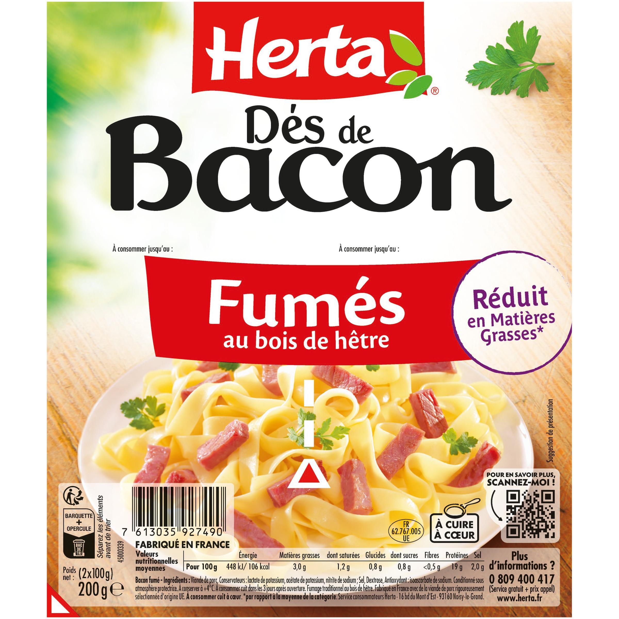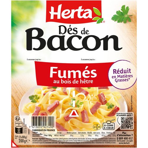 Avec les dés de bacon HERTA, vous pouvez réaliser rapidement et facilement une multitude de recettes en un tour de main, des plus simples (salade, quiche, pâtes…) aux plus élaborées. Fumées au bois de hêtre, ces dés de bacon ne contiennent que 3% de matière grasse et vous permettent de donner du goût à vos plats en toute légèreté.