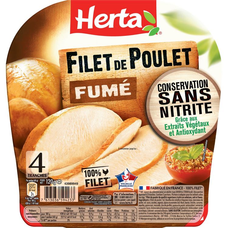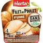 Filet de poulet de qualité supérieure traité en salaison, cuit et fumé Découvrez le Filet de Poulet Fumé Conservation Sans Nitrite de HERTA : une délicieuse gamme de jambon de poulet, 100% filet de poulet, qui vous accompagne au quotidien pour faire plaisir à toute la famille. Le Filet de Poulet fumé, ce sont des tranches épaisses et généreuses de filets de poulet 100% français et fumés, pour varier les plaisirs.