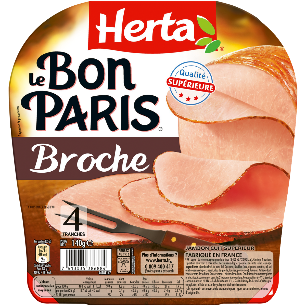 Jambon cuit supérieur Le jambon blanc LE BON PARIS, c'est le jambon qui plait à toute la famille : un jambon de qualité, pour le plaisir de tous, véritable allié du quotidien. Découvrez LE BON PARIS à la broche, un jambon lentement rôti à la broche, délicatement grillé en surface et moelleux à coeur. Une recette idéale pour varier les plaisirs en famille.