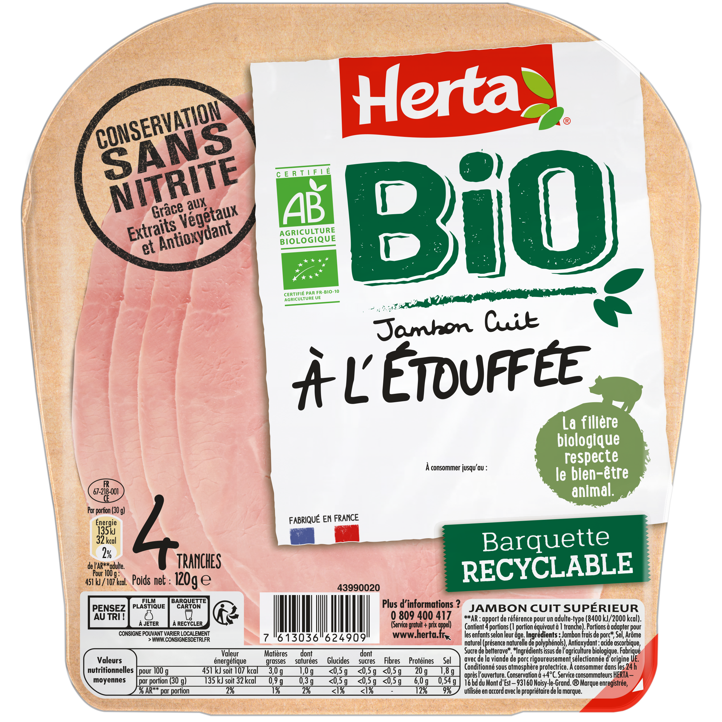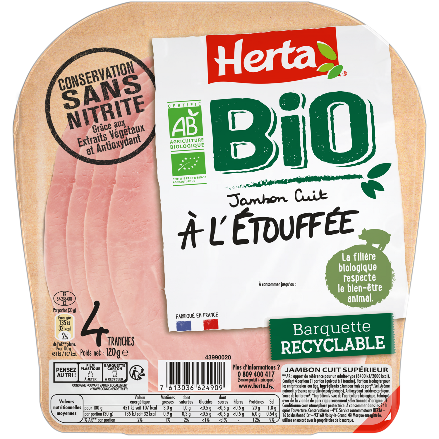 Jambon cuit supérieur Découvrez le jambon BIO Conservation Sans Nitrite à l'Etouffée de HERTA : le premier jambon de marque nationale BIO et conservation sans nitrite. Du jambon frais de porc biologique, du bouillon travaillé avec des arômes naturels,du sucre, du sel et de l’acide ascorbique (Vitamine C) pour son rôle antioxydant! Retrouvez dans cette recette BIO, nos belles tranches et la cuisson lente à l'Etouffée Herta, qui plairont à toute la famille !