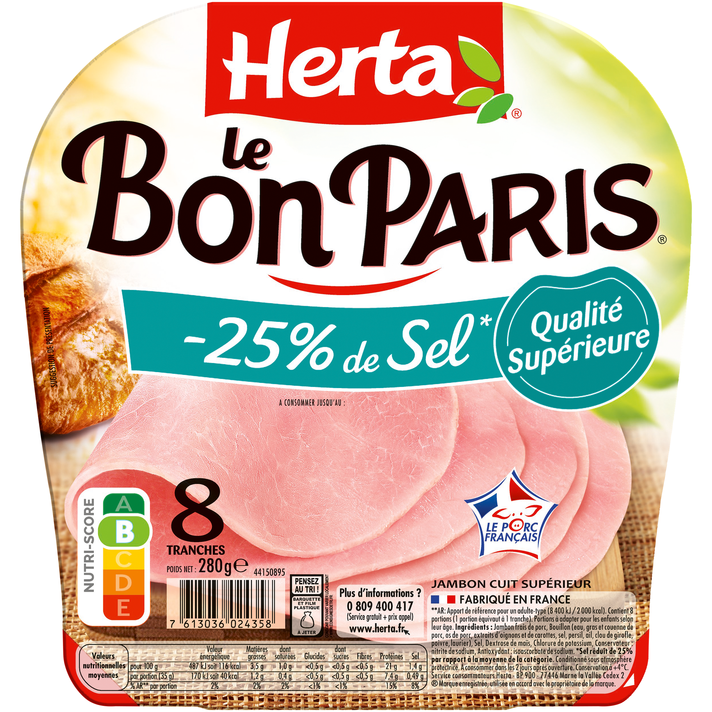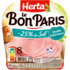 Le jambon de porc LE BON PARIS, c'est le jambon qui plait à toute la famille : un jambon de qualité, pour le plaisir de tous, véritable allié du quotidien. Découvrez LE BON PARIS -25% de Sel*, la recette qui allie plaisir et nutrition, et qui contribue à l'équilibre de toute la famille. * Sel réduit de 25% par rapport à la moyenne de la catégorie. Jambon cuit supérieur