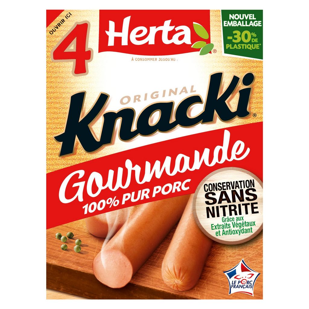 Les saucisses KNACKI Gourmande, c'est la recette des saucisses KNACKI original porc avec un format généreux, idéal pour les gourmands. Les saucisses KNACKI, c'est une viande 100% pur porc français conservation sans nitrite grâce aux extraits végétaux et antioxydant et un fumage traditionnel au bois de hêtre. Pour les enfants de moins de 4 ans, couper la saucisse dans le sens de la longueur puis en tout petits morceaux afin de prévenir les risques d'étouffement.