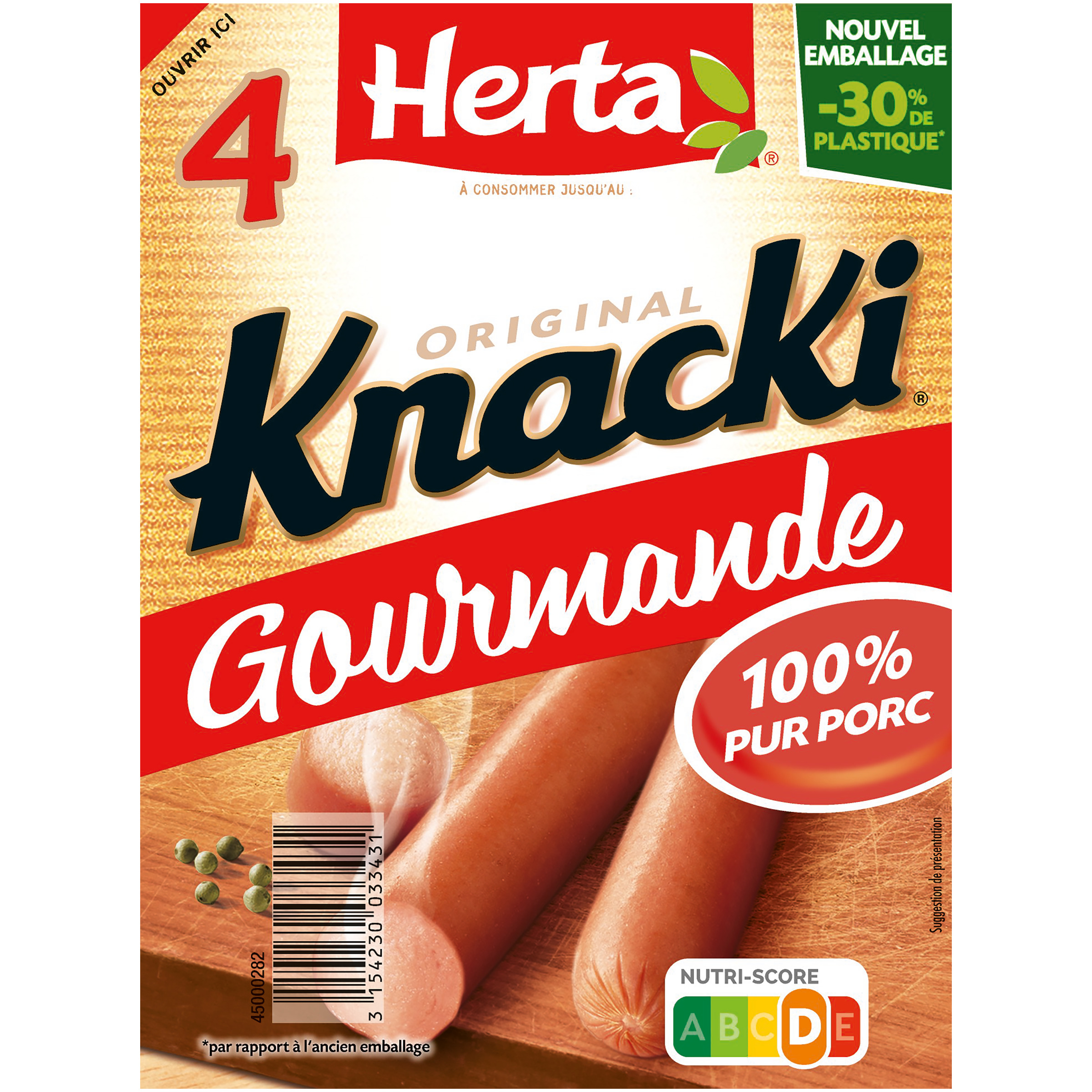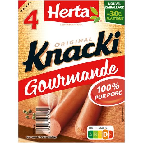Les saucisses KNACKI Gourmande Fumée, c'est la recette des saucisses KNACKI original porc avec un format généreux, idéal pour les gourmands. Les saucisses KNACKI, c'est une viande 100% pur porc et un fumage traditionnel au bois de hêtre. Pour les enfants de moins de 4 ans, couper la saucisse dans le sens de la longueur puis en tout petits morceaux afin de prévenir les risques d'étouffement.