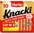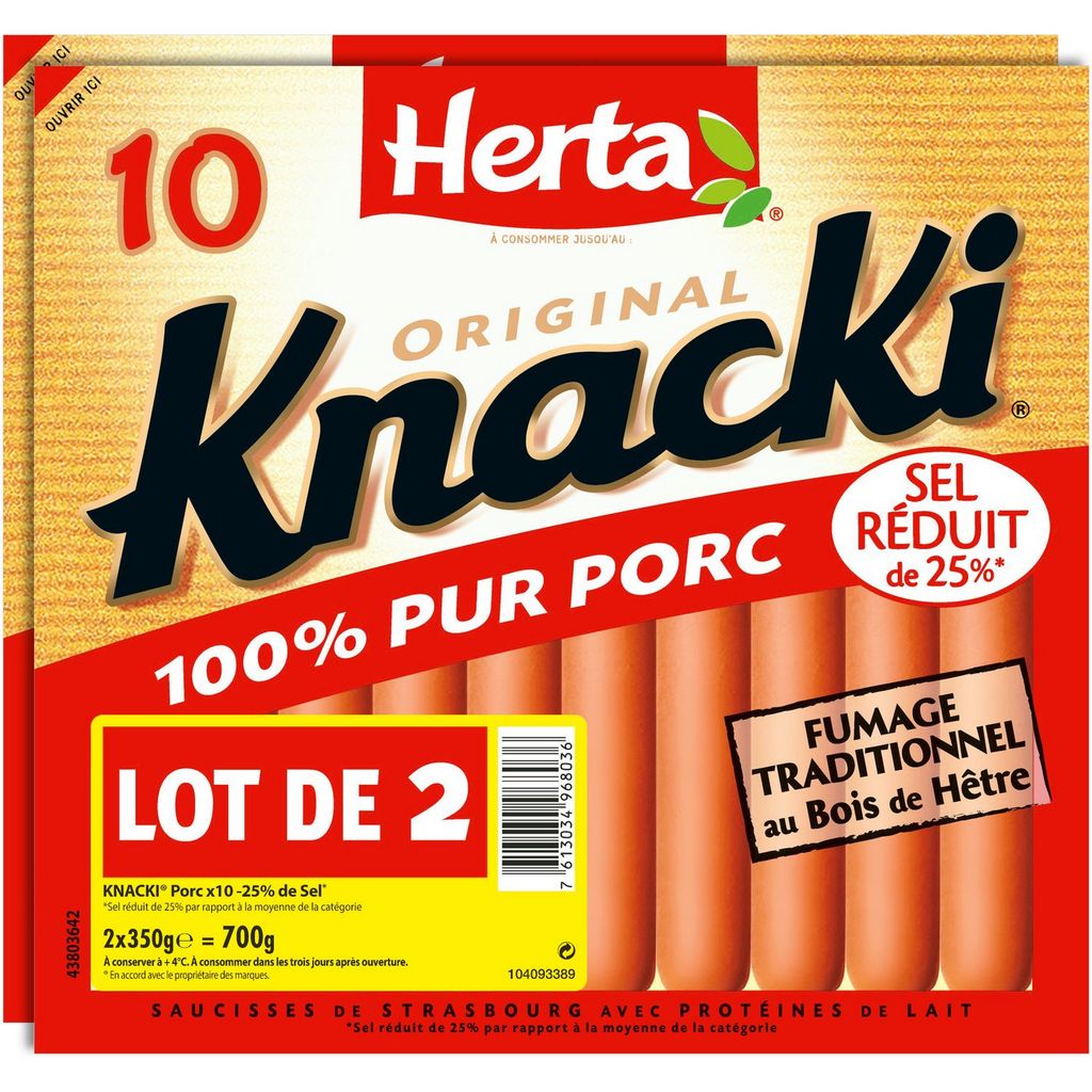 Retrouvez tout le plaisir de KNACKI Original 100% pur porc au goût délicatement fumé au bois de hêtre, avec 25% de sel en moins*. Des saucisses croquantes à l'extérieur et moelleuses à l'intérieur, qui plaisent à tous les gourmands ! Pour les enfants de moins de 4 ans, coupez la saucisse dans le sens de la longueur puis en tout petits morceaux afin de prévenir les risques d’étouffement. (*par rapport à la moyenne de la catégorie ) Saucisse de Strasbourg avec des protéines de lait