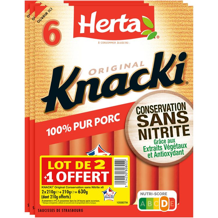 Au micro-ondes (cuisson idéale !) : Sur une assiette placez à 900W le sachet fermé de 4 saucisses : 50 sec, 6 saucisses : 1 min, 10 saucisses : 1 min 30 sec. A la casserole : Plongez les saucisses Knacki hors de leur sachet dans l'eau frémissante 4 min. A la poêle : Déposez les saucisses Knacki dans une poêle chaude et laissez cuire à feu moyen en les tournant régulièrement 4 min.