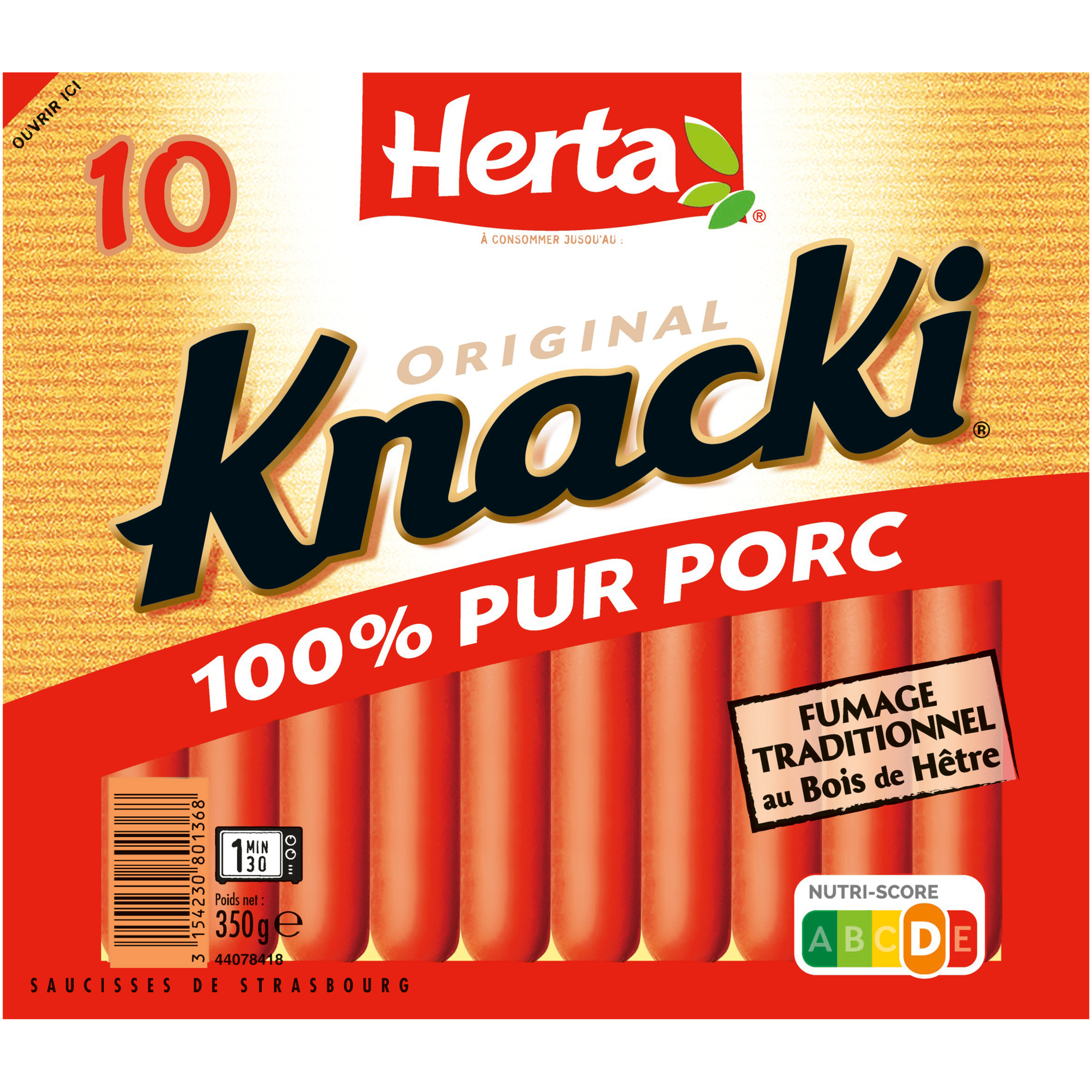 Avec KNACKI Original 100% pur porc au goût délicatement fumé au bois de hêtre, savourez tout le plaisir de la recette originale des saucisses KNACKI. Des saucisses croquantes à l'extérieur et moelleuses à l'intérieur, qui plaisent à tous les gourmands ! Pour les enfants de moins de 4 ans, coupez la saucisse dans le sens de la longueur puis en tout petits morceaux afin de prévenir les risques d'étouffement.