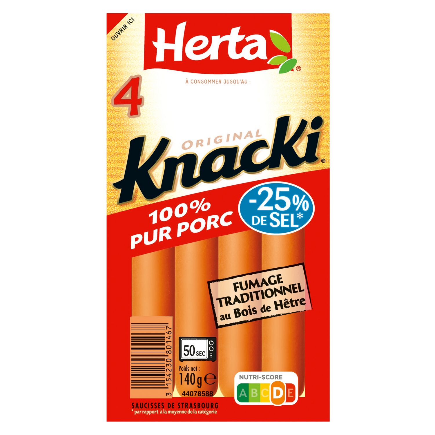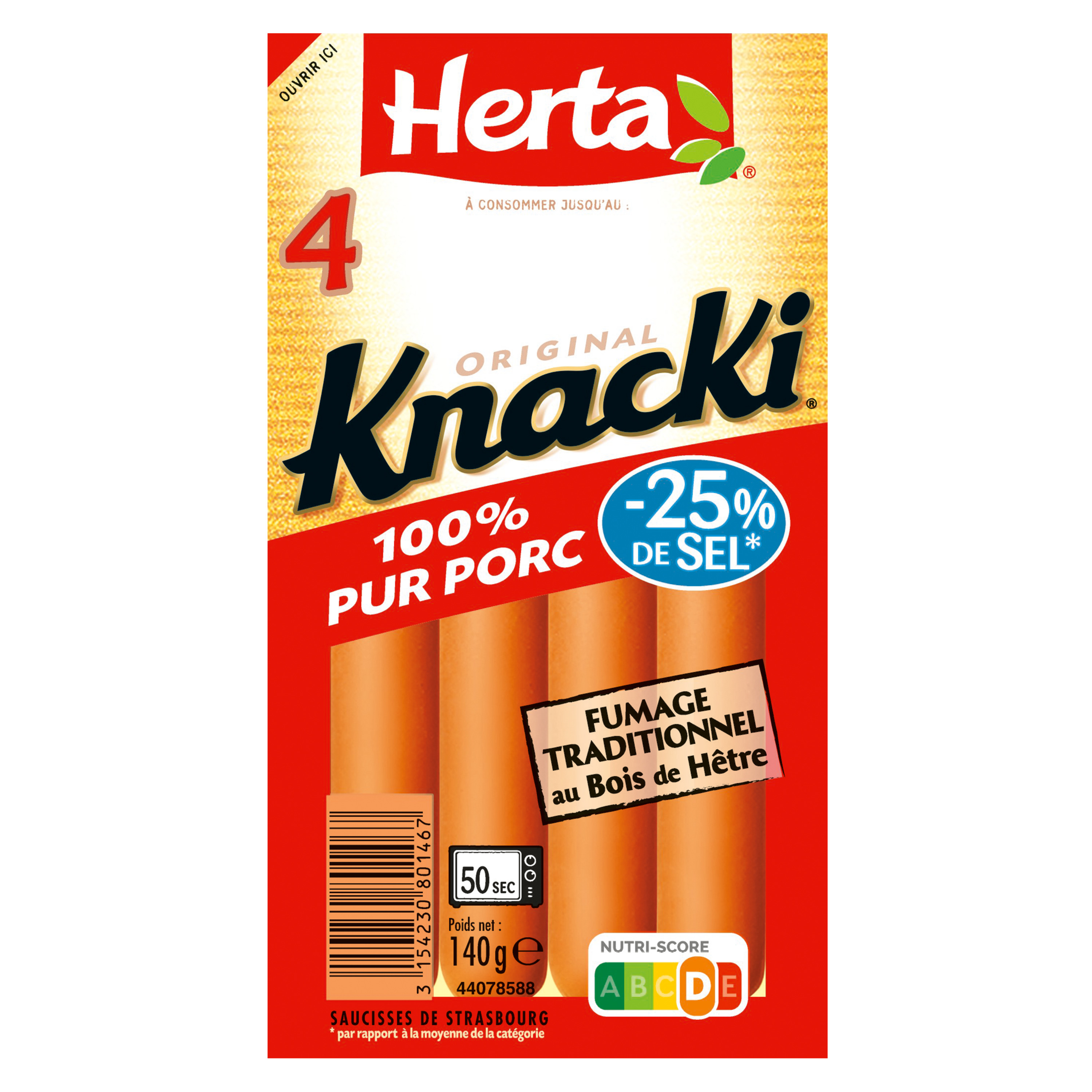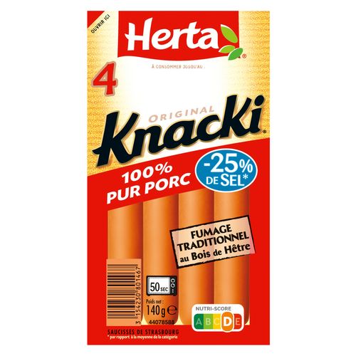 Tout le plaisir de KNACKI Original 100% pur porc au goût délicatement fumé au bois de hêtre, avec 25% de sel en moins*.Pour les enfants de moins de 4 ans, couper la saucisse dans le sens de la longueur puis en tout petits morceaux afin de prévenir les risques d'étouffement. (*par rapport à la moyenne de la catégorie ).