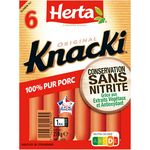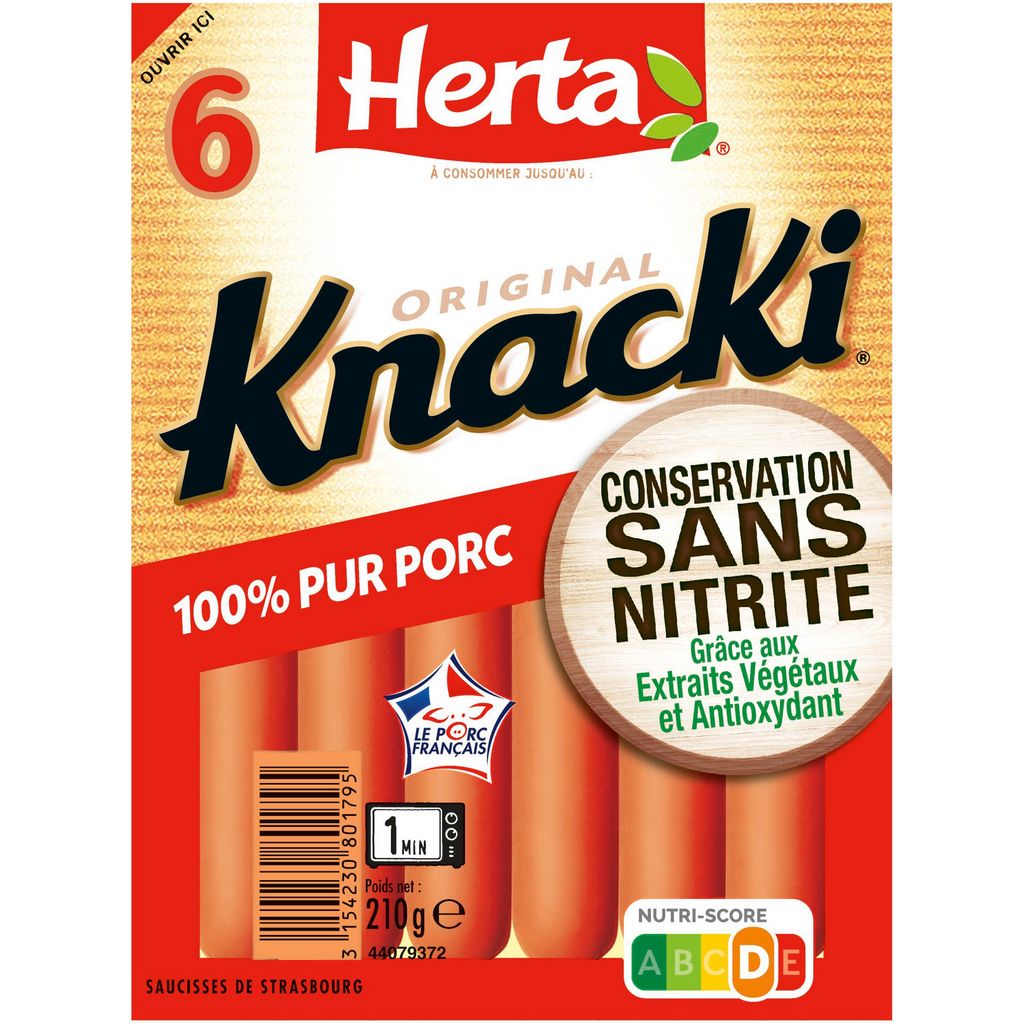 Découvrez KNACKI Original Conservation Sans Nitrite : la première* saucisse de strasbourg du marché au mode de conservation sans nitrite grâce aux extraits végétaux et antioxydant. Des saucisses croquantes à l'extérieur et moelleuses à l'intérieur, qui plaisent à tous les gourmands ! Pour les enfants de moins de 4 ans, coupez la saucisse dans le sens de la longueur puis en tout petits morceaux afin de prévenir les risques d'étouffement. *1ère marque lancée en grandes surfaces alimentaires à échelle nationale.