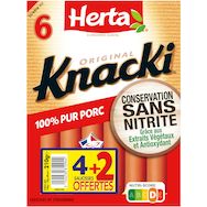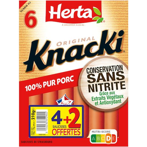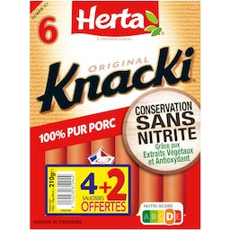 Découvrez KNACKI Original Conservation Sans Nitrite : la première* saucisse de strasbourg du marché au mode de conservation sans nitrite grâce aux extraits végétaux et antioxydant. Des saucisses croquantes à l'extérieur et moelleuses à l'intérieur, qui plaisent à tous les gourmands ! Pour les enfants de moins de 4 ans, coupez la saucisse dans le sens de la longueur puis en tout petits morceaux afin de prévenir les risques d'étouffement. *1ère marque lancée en grandes surfaces alimentaires à échelle nationale.