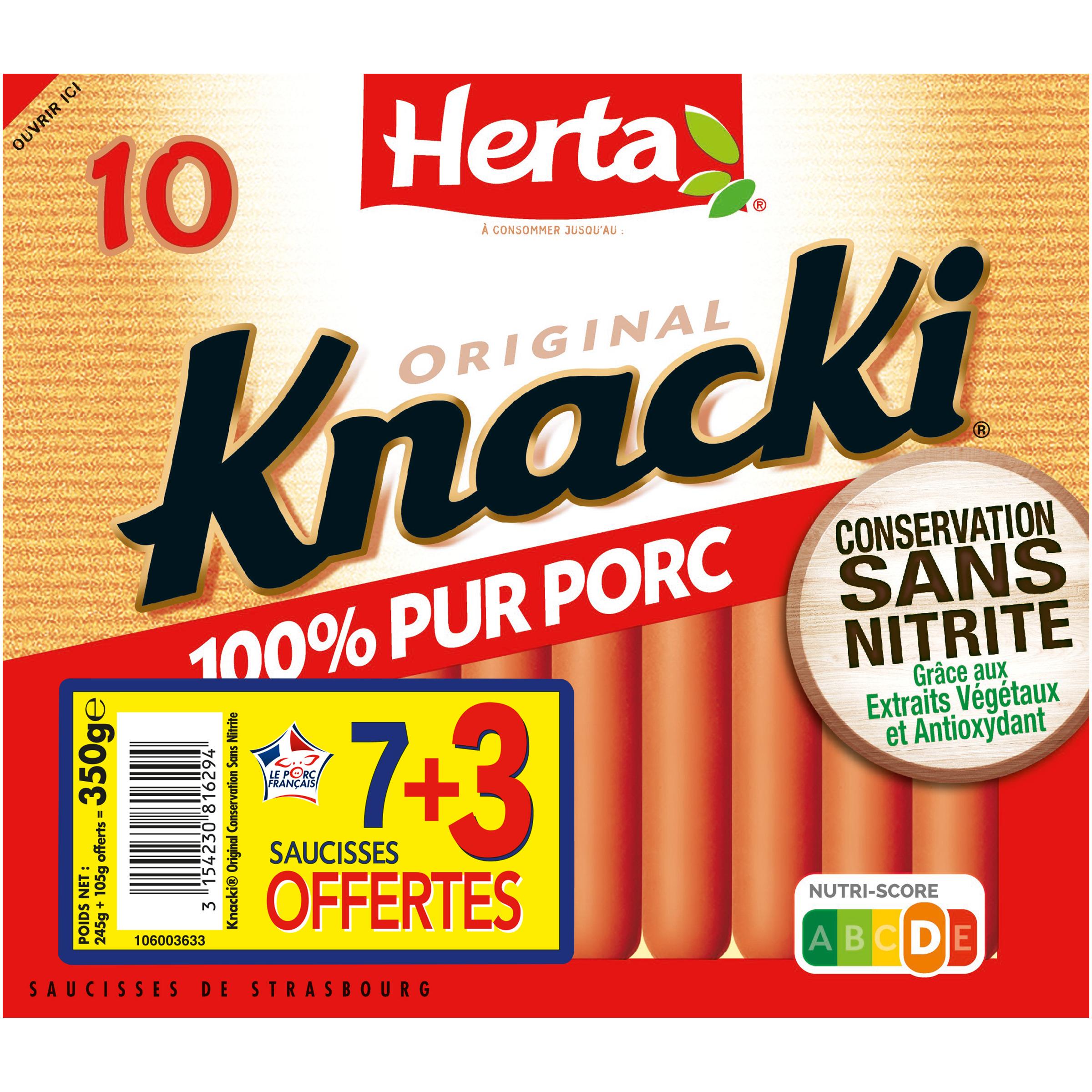 Découvrez KNACKI ORIGINAL Conservation Sans Nitrite : la célèbre saucisse KNACKI Original 100% Pur Porc en version conservation sans nitrite grâce aux extraits végétaux et antioxydant et avec de la viande de porc 100% française. Des saucisses croquantes à l'extérieur et moelleuses à l'intérieur, qui plaisent à tous les gourmands ! Pour les enfants de moins de 4 ans, coupez la saucisse dans le sens de la longueur puis en tout petits morceaux afin de prévenir les risques d'étouffement.