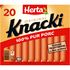 Cuisson optimale au micro-ondes : Placez le sachet fermé sur une assiette à 900 W pendant 1 min 30, retournez le sachet et faites chauffer de nouveau 1 min 30. Pour 2 Knacki placez-les sur une assiette couverte pendant 30 sec (pour 4 : 1 min ; pour 6 : 1 min 15). A la casserole : Plongez les saucisses Knacki 4 min dans l'eau frémissante.