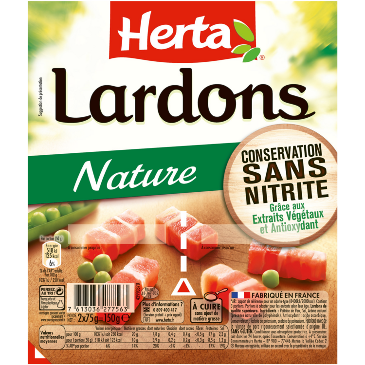 Découvrez les lardons nature Conservation Sans Nitrite HERTA, les premiers lardons sans nitrite du marché ! Avec les lardons HERTA, vous pouvez réaliser vos recettes facilement en un tour de main.De qualité supérieure, pratiques et savoureux, ils apporteront une touche de gourmandise et de plaisir à vos petits plats du quotidien. Les Lardons Nature Conservation Sans Nitrite Herta raviront vos papilles tout en vous garantissant une conservation optimale et une sécurité alimentaire parfaite. Lardons de qualité supérieure