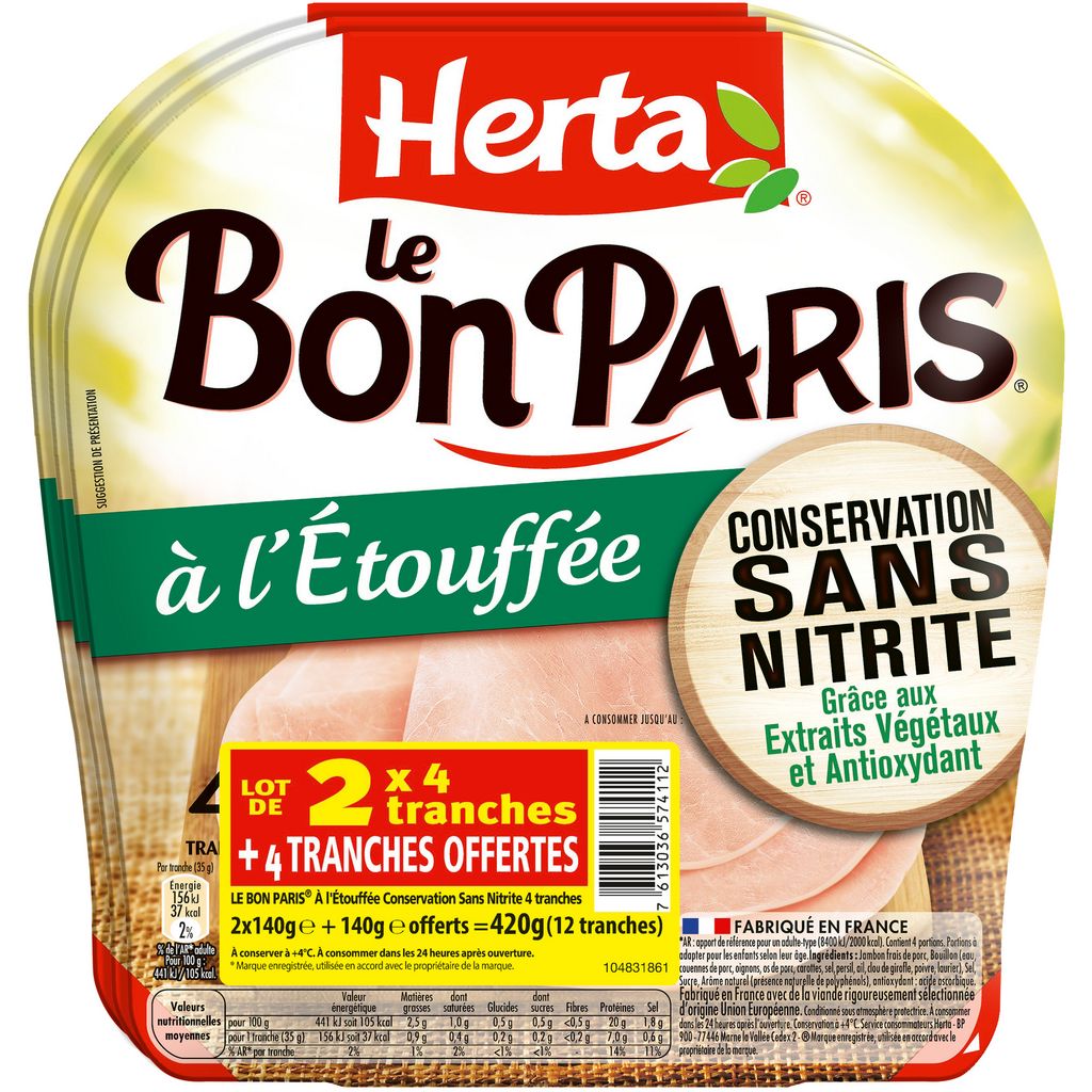 Découvrez la gamme LE BON PARIS Conservation Sans Nitrite : le premier* jambon du marché au mode de conservation sans nitrite; Du jambon frais de porc rigoureusement sélectionné, du bouillon travaillé avec des arômes naturels, une pincée de sel, une touche de sucre et de l'acide ascorbique (Vitamine C) pour son rôle antioxydant. De belles tranches et une recette à l'Etouffée, qui plairont à toute la famille ! *1ère marque distribuée à l’échelle nationale. Viande de porc français.