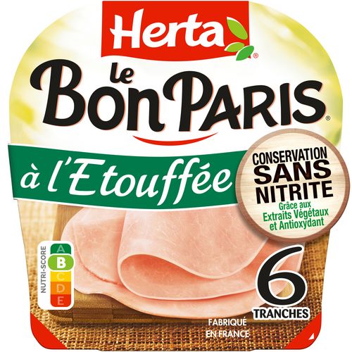 Découvrez la gamme LE BON PARIS Conservation Sans Nitrite : le premier* jambon du marché au mode de conservation sans nitrite, élaboré à partir d'ingrédients d'origine naturelle. Du jambon frais de porc rigoureusement sélectionné, du bouillon travaillé avec des arômes naturels, une pincée de sel, une touche de sucre... et c'est tout ! De belles tranches et une recette à l'Etouffée, qui plairont à toute la famille ! *1ère marque distribuée à l'échelle nationale