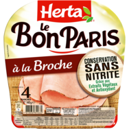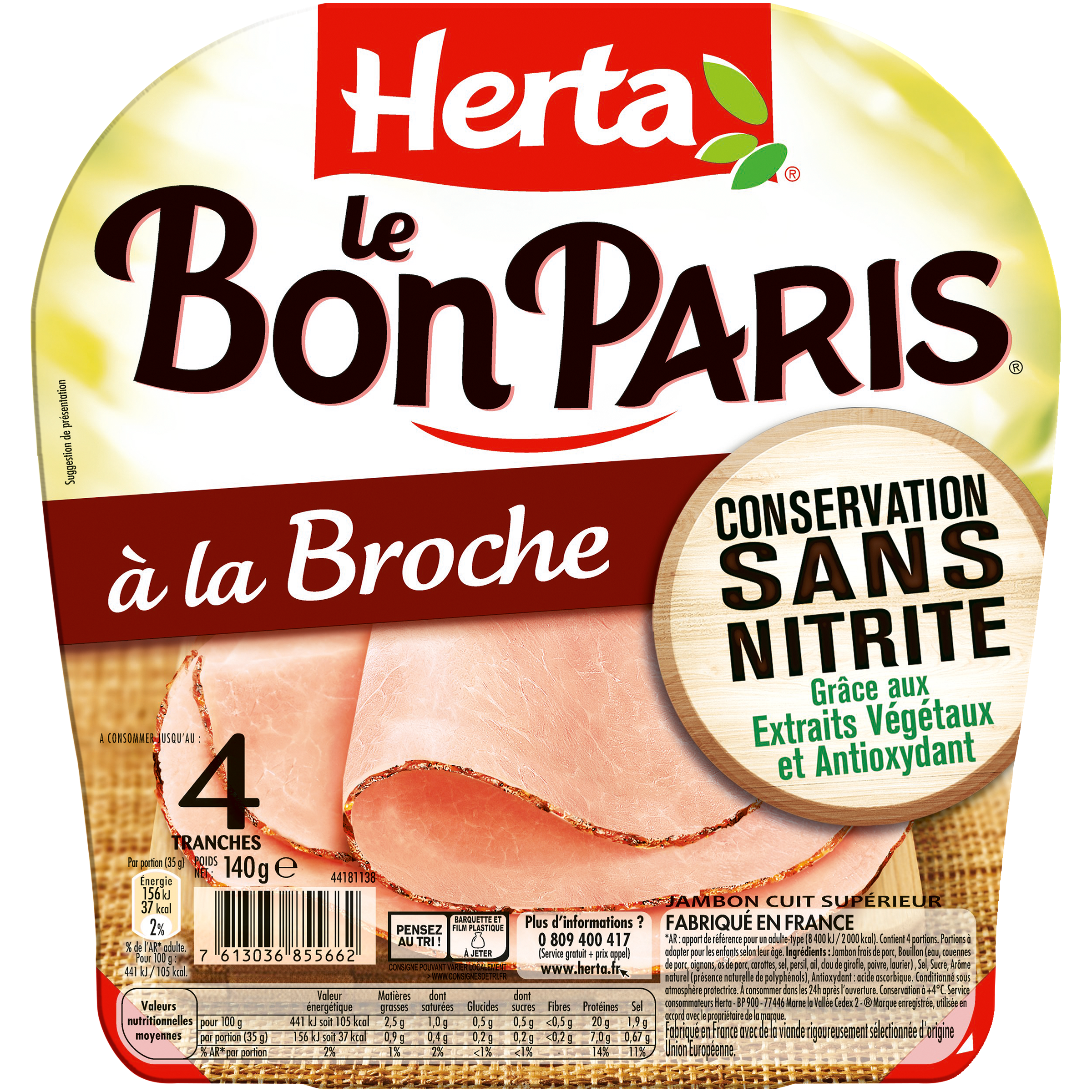 Jambon cuit supérieur Découvrez la gamme LE BON PARIS Conservation Sans Nitrite : le premier jambon du marché au mode de conservation sans nitrite grâce aux extraits végétaux et antioxydant. De belles tranches et une recette à la broche, qui plairont à toute la famille !