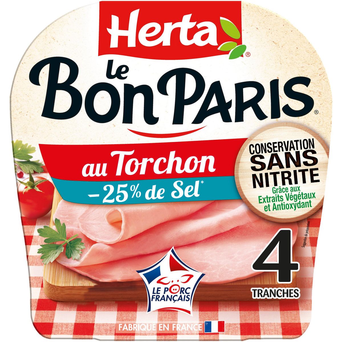 Découvrez la gamme LE BON PARIS Conservation Sans Nitrite -25% de sel* : le premier** jambon du marché au mode de conservation sans nitrite grâce aux extraits végétaux et antioxydant et à teneur en sel réduite*. Du jambon frais de porc rigoureusement sélectionné, du bouillon travaillé avec des arômes naturels riches en polyphénols, une pincée de sel, une touche de sucre et de l'acide ascorbique pour son rôle antioxydant. * Sel réduit de 25% par rapport à la moyenne de la catégorie. **1ère marque lancée en grandes surfaces alimentaires à échelle nationale