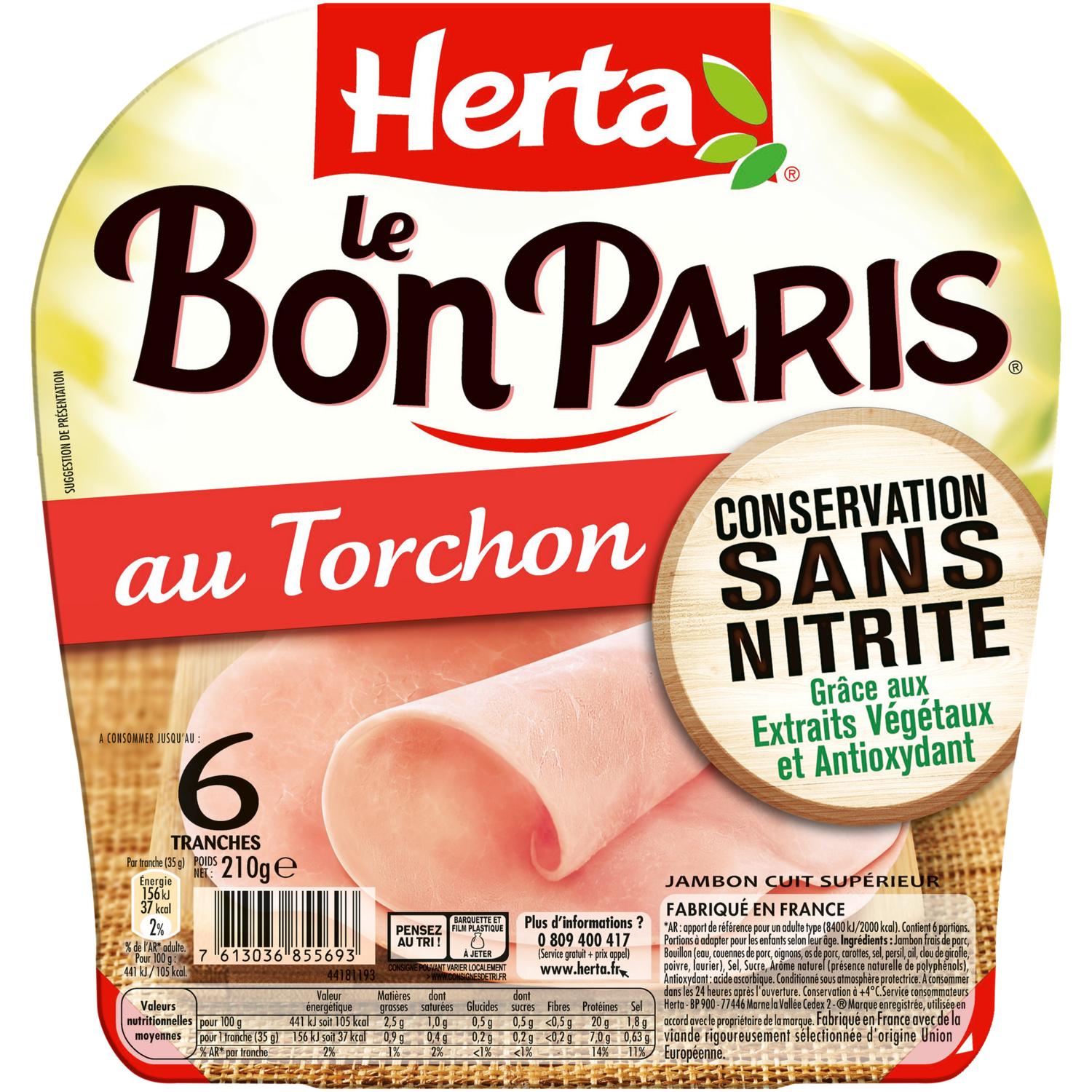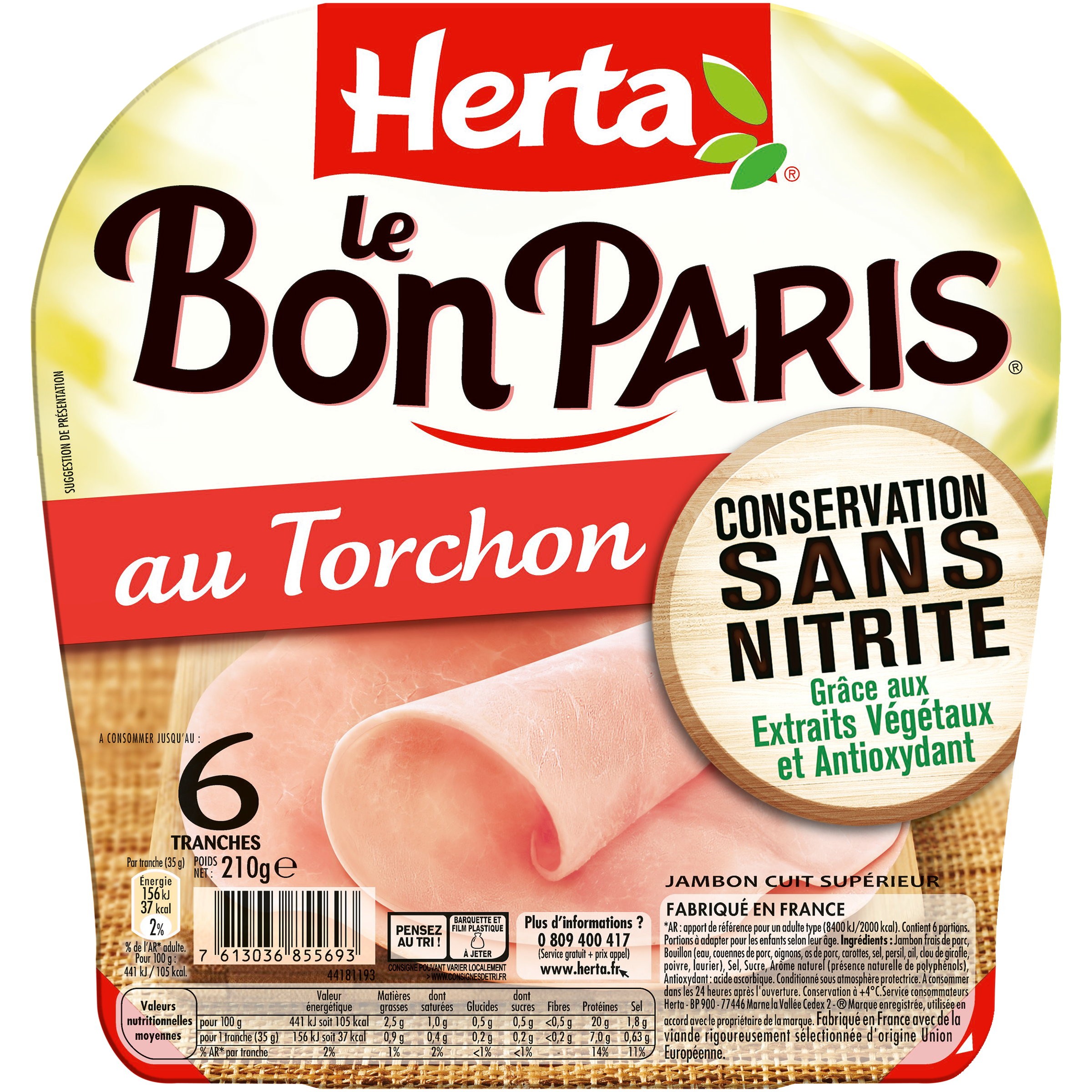 Découvrez la gamme LE BON PARIS Conservation Sans Nitrite : le premier jambon du marché au mode de conservation sans nitrite, élaboré à partir d'ingrédients d'origine naturelle. Du jambon frais de porc rigoureusement sélectionné, du bouillon travaillé avec des arômes naturels, une pincée de sel, une touche de sucre... et c'est tout ! De belles tranches et une recette au torchon, qui plairont à toute la famille ! Jambon cuit supérieur