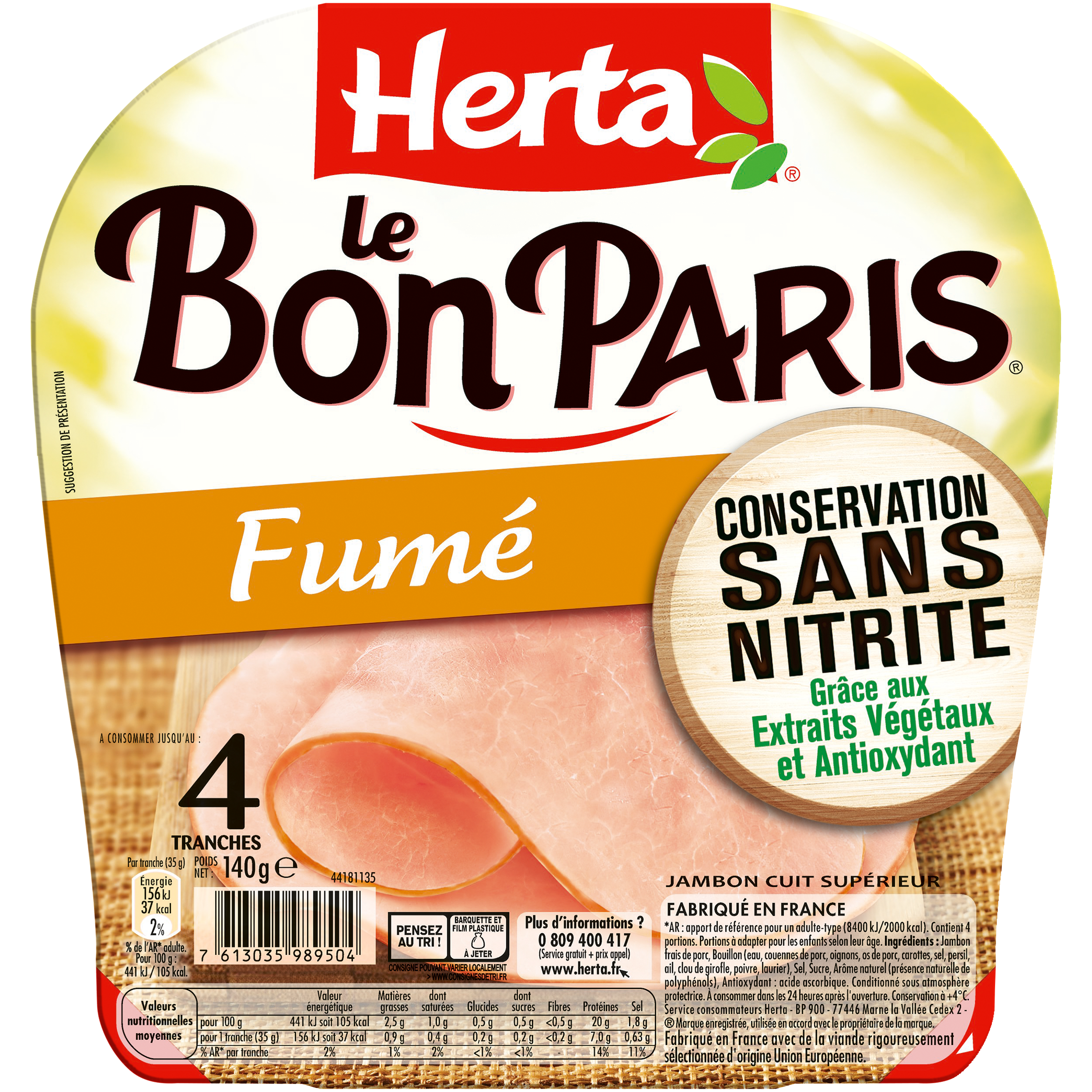 Découvrez la gamme LE BON PARIS Conservation Sans Nitrite : le premier* jambon du marché au mode de conservation sans nitrite, élaboré à partir d'ingrédients d'origine naturelle. Du jambon frais de porc rigoureusement sélectionné, du bouillon travaillé avec des arômes naturels, une pincée de sel, une touche de sucre... et c'est tout ! De belles tranches et une recette fumée, qui plairont à toute la famille ! *1ère marque distribuée à l’échelle nationale Jambon cuit supérieur