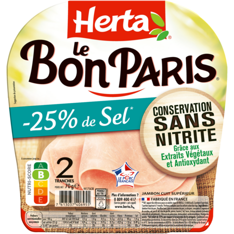 Jambon cuit supérieur Découvrez la gamme LE BON PARIS Conservation Sans Nitrite Sel Réduit : le premier* jambon du marché au mode de conservation sans nitrite grâce aux extraits végétaux et antioxydant à teneur en sel réduite**. Du jambon frais de porc rigoureusement sélectionné, du bouillon travaillé avec des arômes naturels riches en polyphénols, une pincée de sel, une touche de sucre et de l'acide ascorbique (Vitamine C) pour son rôle antioxydant. De belles tranches et une recette à l'Etouffée, qui plairont à toute la famille ! *1ère marque distribuée à l’échelle nationale **Sel réduit de 25% par rapport à la moyenne de la catégorie.