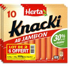 Saucisses de Strasbourg avec protéines de lait Tout le plaisir de KNACKI dans une recette au jambon avec 30% de matière grasse en moins* et toujours un fumage traditionnel au bois de hêtre. Pour les enfants de moins de 4 ans, couper la saucisse dans le sens de la longueur puis en tout petits morceaux afin de prévenir les risques d’étouffement. (*par rapport à la moyenne de la catégorie).