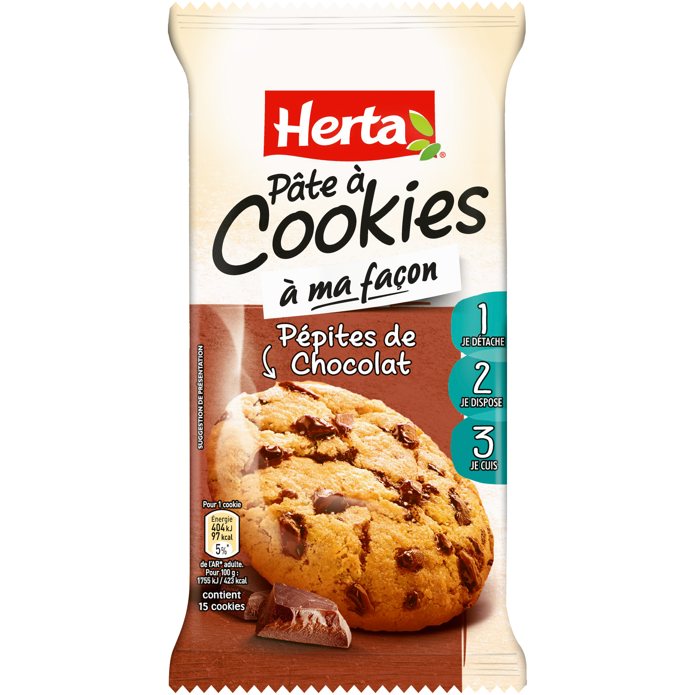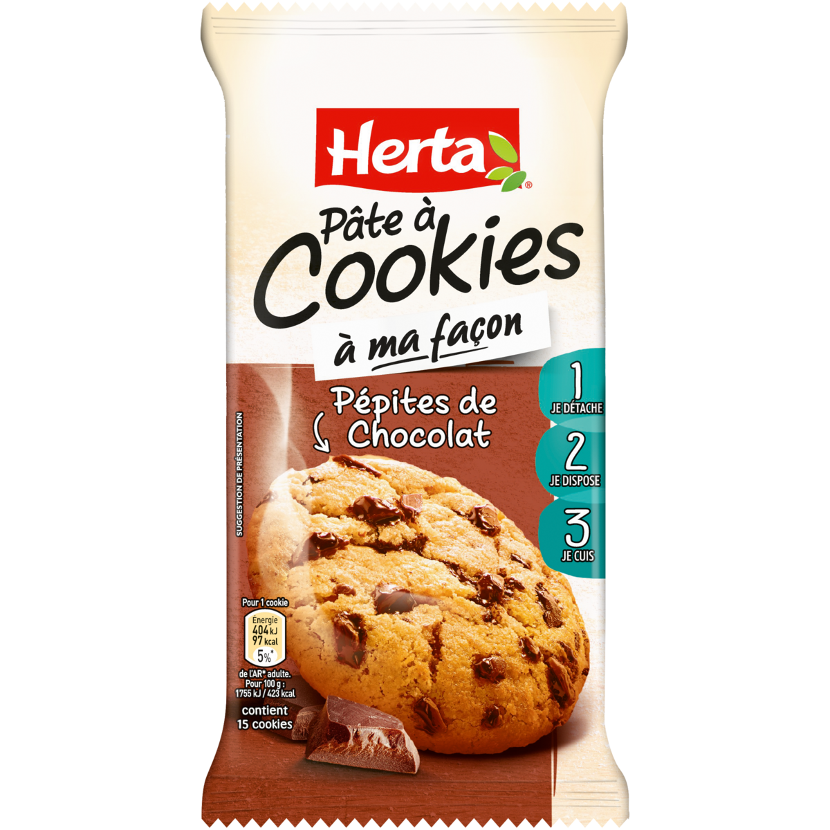 Pâte pour biscuits avec pépites de chocolat 22% Un cookie chaud, c'est encore meilleur ! Réalisez une quinzaine de délicieux Cookies avec la préparation à ma façon d'HERTA. Une pâte prête à cuire, pour préparer une pause délicieuse et gourmande ou le quatre heures des enfants. Et pour varier les plaisirs et trouver de nouvelles idées pour personnaliser vos recettes, découvrez toutes nos astuces culinaires et recettes sur www.herta.fr.
