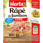 Avec les ingrédients cuits HERTA, vous gagnez du temps pour décliner vos recettes préférées en un tour de main ! Pratique à saupoudrer, le râpé de Jambon HERTA -25% de sel est idéal pour agrémenter vos plats de tous les jours et varier les plaisirs avec 25% de sel en moins par rapport à la moyenne de la catégorie. Jambon cuit standard fumé