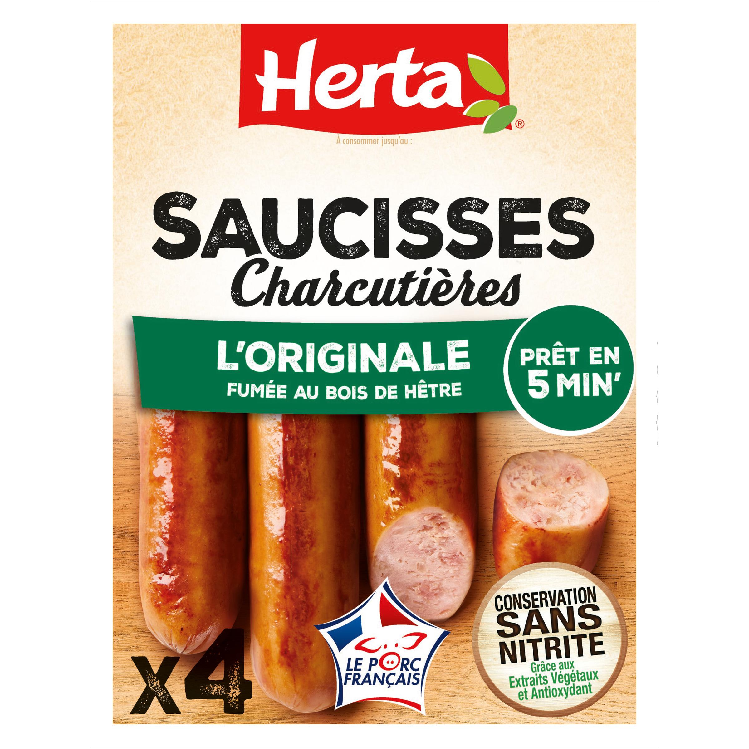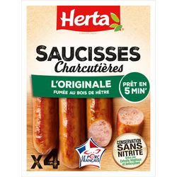 Découvrez la nouvelle gamme de saucisses charcutières Herta, de délicieuses saucisses 100% pur porc fumées au bois de hêtre avec des inclusions de morceaux de viande de porc française. Garanties conservation sans nitrite grâce aux extraits végétaux et antioxydant, elles sont parfaites pour les repas du quotidien. Elles allient saveur et praticité grâce à une cuisson rapide et sans effort. Une solution idéale pour les familles pressées ou les repas improvisés ! Pour les enfants de moins de 4 ans, couper la saucisse dans le sens de la longueur puis en tout petits morceaux afin de prévenir les risques d'étouffement.