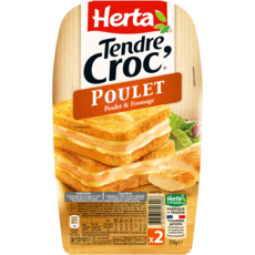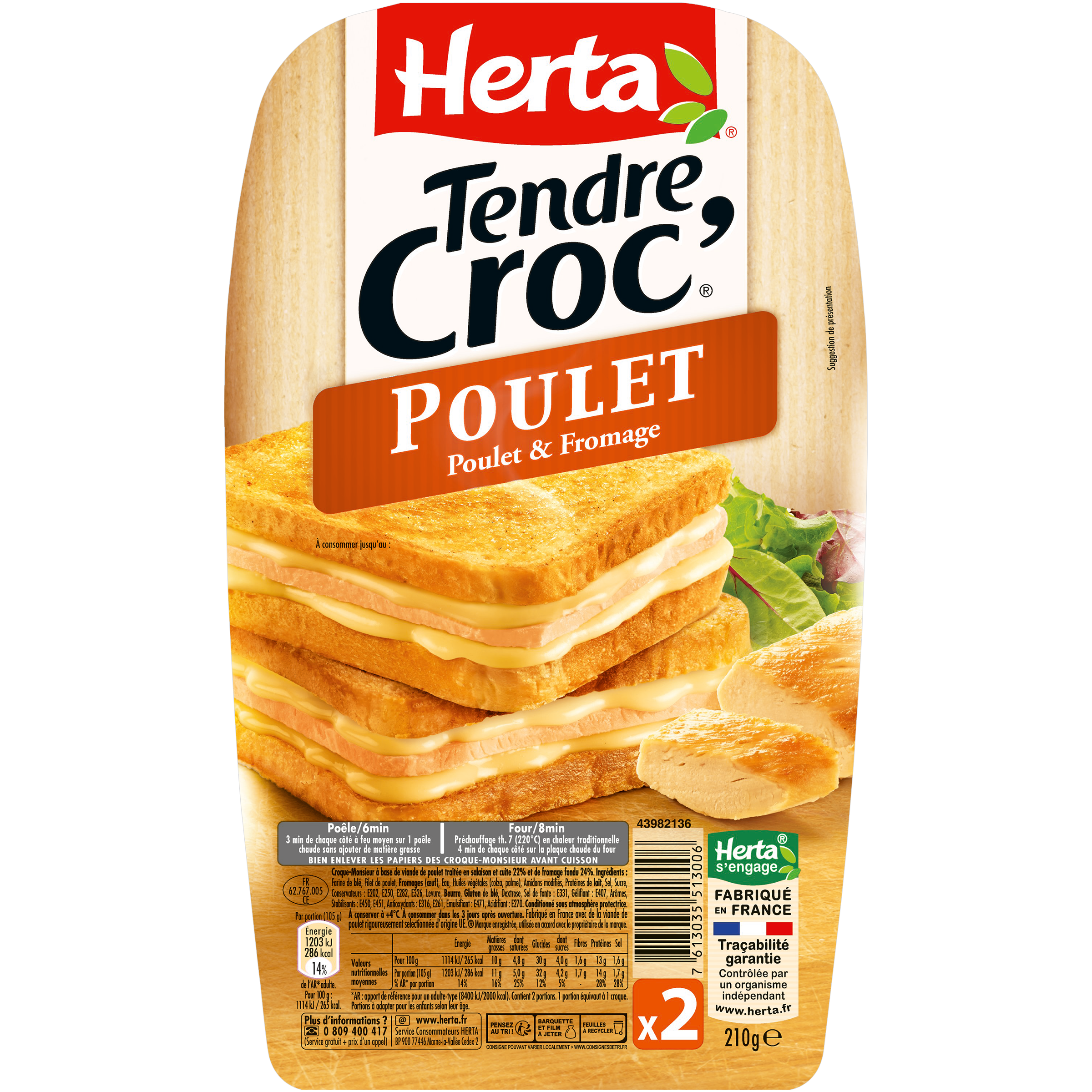 Croque-monsieur à base de viande de poulet traitée en salaison et cuite 22% et de fromage fondu 24% Savourez les croque-monsieur TENDRE CROC' Poulet : deux tranches de pain de mie moelleuses avec une garniture fondante au bon goût de poulet et au fromage. Les croque-monsieur de HERTA, c'est la solution pratique pour une pause déjeuner, un dîner gourmand en famille ou entre amis. Au four ou à la poêle, tout le monde se régale !