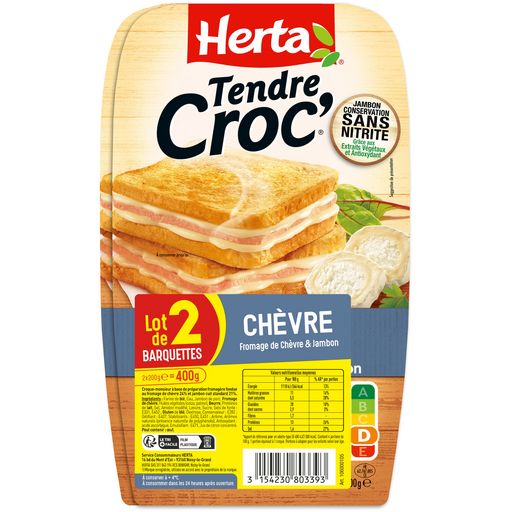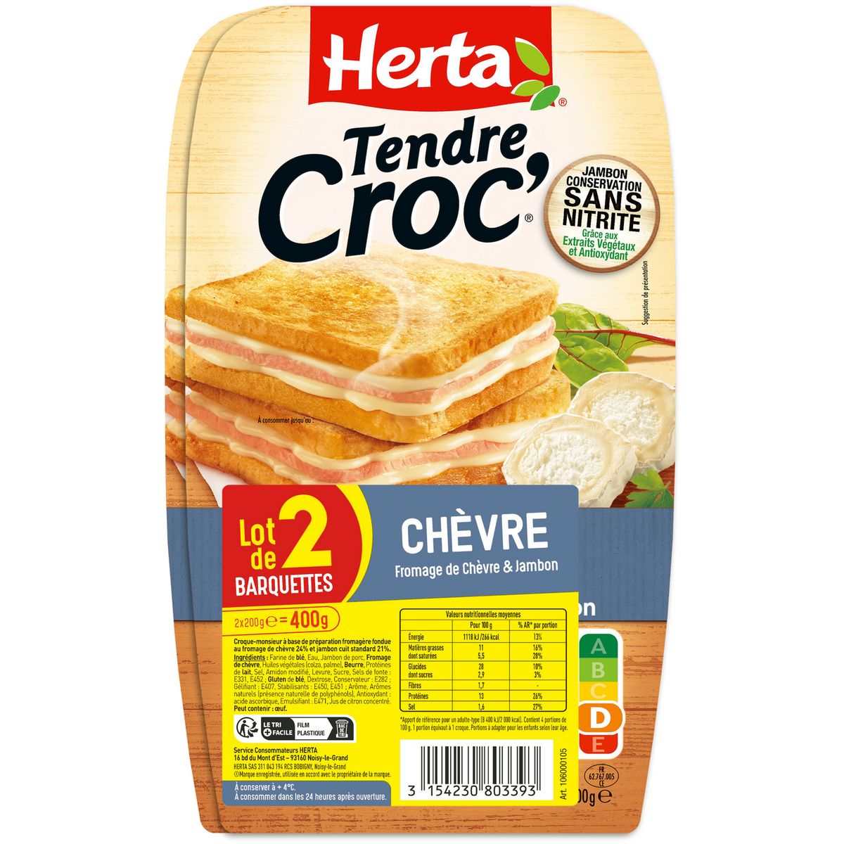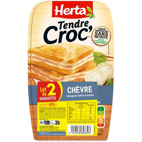 Savourez les croque-monsieur TENDRE CROC'(R) Chèvre : deux tranches de pain de mie à la fois croustillantes et moelleuses avec une garniture fondante au fromage de chèvre et au jambon conservation sans nitrite grâce aux extraits végétaux et antioxydant. Les croque-monsieur de HERTA(R), c'est la solution pratique pour une pause déjeuner, un dîner gourmand en famille ou entre amis. Au four ou à la poêle, tout le monde se régale !